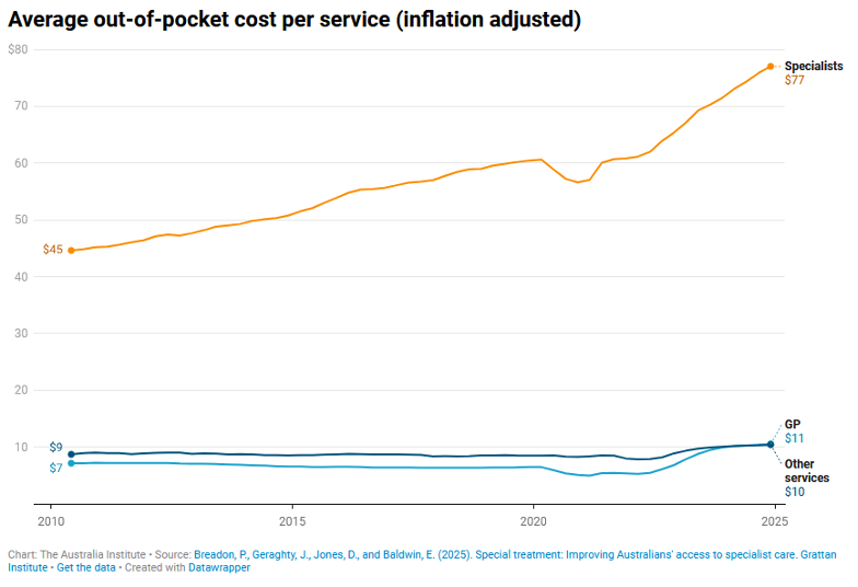 Adjusted for inflation, specialist fees have grown by a whopping 78% since 2010. That’s about 4% on top of the consumer price index. For context, the 4.4% increase to private health insurance premium becomes 0.6% when inflation is taken into account. Even after subtracting the amount covered by Medicare, specialists fees grew by 73%. By comparison, the out-of-pocket costs for other medical services that Australians rely on, including trips to the GP, have risen only as much as inflation.