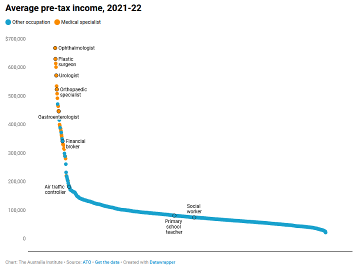 Professor Brendan Murphy — a kidney specialist who served as Australia’s Chief Medical Officer from 2016 to 2023 (during the pandemic) — argues that specialists have developed a “sense of entitlement”. He also says that they exhibit cartel-like behaviour. Indeed, several of the top specialties including ophthalmology, dermatology and obstetrics appear to have limited the number of trainees over the past decade. Limiting supply is a good way to raise prices. Murphy has called specialist fees the “challenge of our time”, and points out that medical specialists – especially ‘procedural’ ones like surgeons, ophthalmologists and cardiologists — are among Australia’s highest earning occupations.